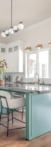 The kitchen truly is the heart of the home, and while this space was already in good shape, we knew it deserved a facelift. We started by swapping out the existing backsplash for a classic subway tile, adding a timeless touch that enhances the overall aesthetic. To elevate the ambiance, we introduced an eye-catching chandelier that brings character to the room. We also upgraded the countertops to a stunning dark polished marble, providing a striking contrast and a luxurious feel. To add an unexpected twist, we decided to paint the kitchen island a beautiful green, creating a bold contrast that draws the eye and adds depth to the space.