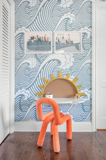 The second little boy’s room was all about bringing a playful marine life vibe without going overboard—pun totally intended! We chose a whimsical wave-inspired wallpaper that feels cartoon-like, adding just the right amount of fun to the space. To keep it from feeling too much like a full-blown ocean theme, we introduced pops of color with accents in red, yellow, and orange. These bright touches brought energy and interest to the room, keeping it vibrant yet balanced. The result is a space that feels lively and imaginative, with subtle nods to marine life while still allowing for plenty of flexibility as the little one grows.